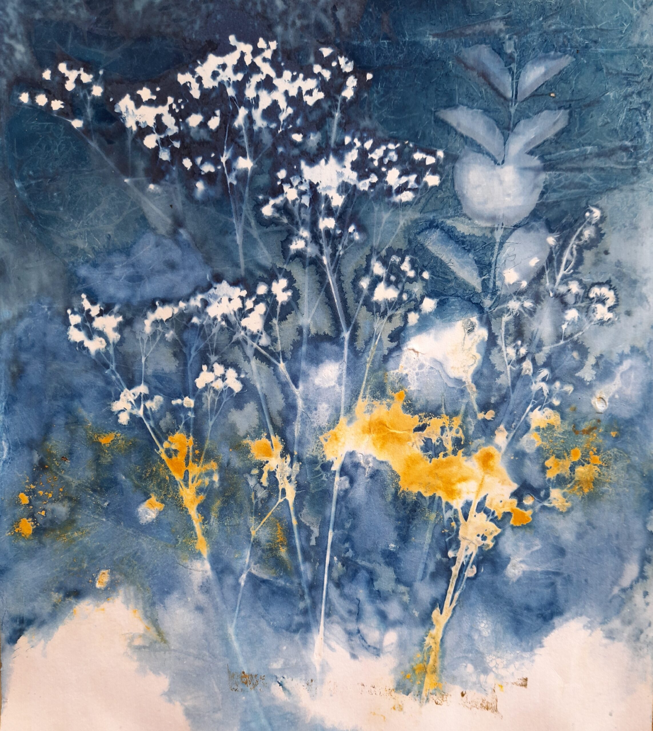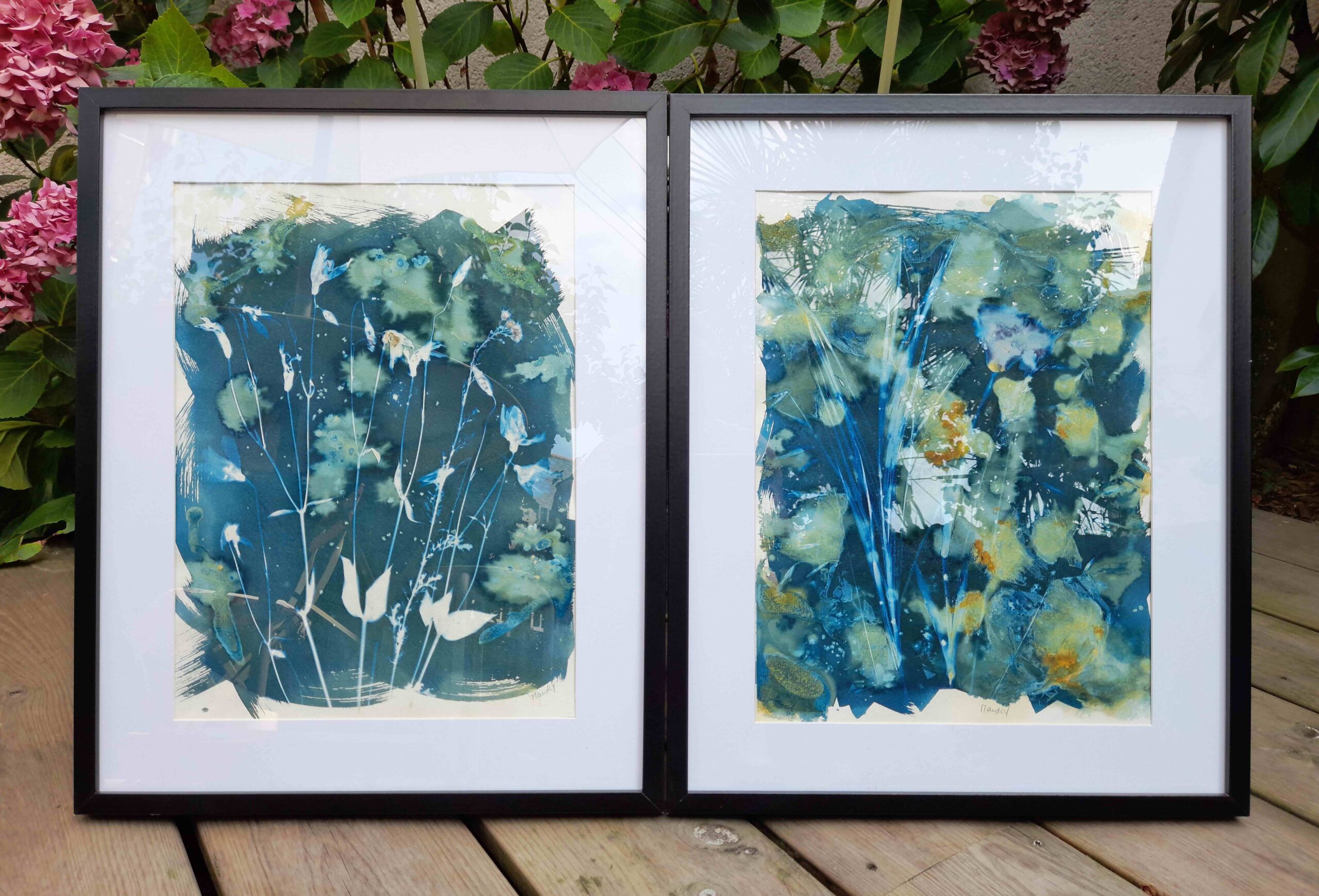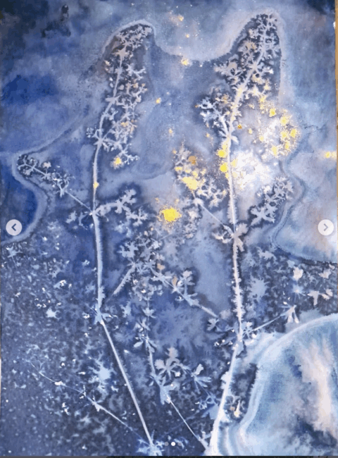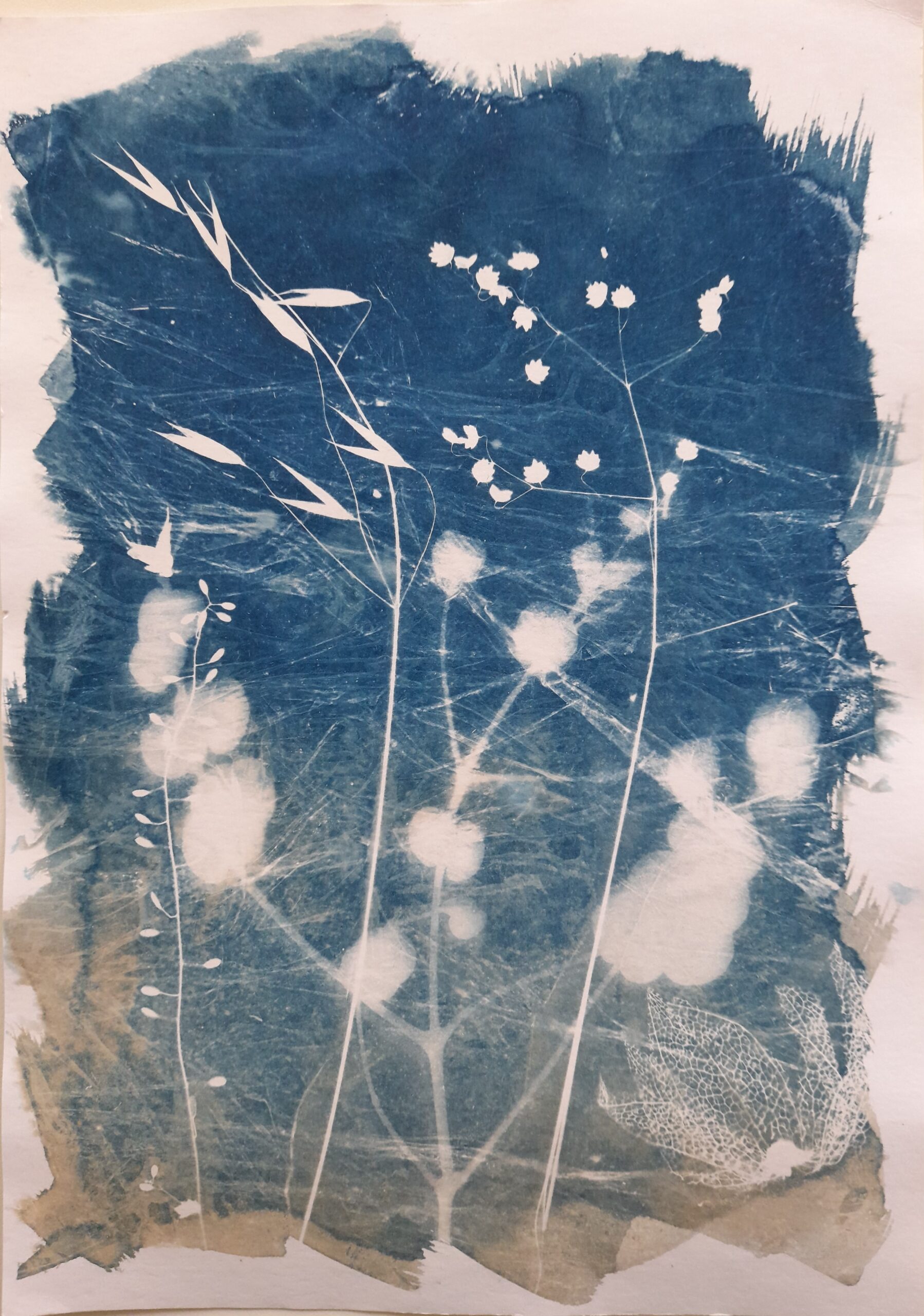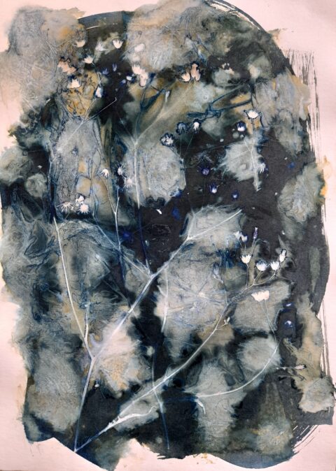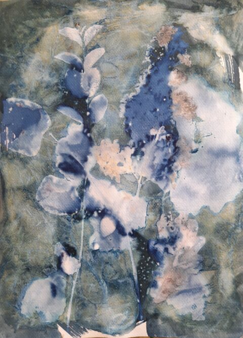 • Depuis près de 10 ans, je redonne de plus en plus de place à des créations plus personnelles éloignées de l’outil numérique : dessins, peintures, aquarelles, photographies, photogrammes, terres cuites (modelage et tour), création de papiers, lampes, bijoux, tissages, mosaïques… et plus récemment la gravure et la lithographie aux Beaux-Arts, ces disciplines ouvrant un champ des possibles enthousiasmant et novateur pour moi. Je pratique régulièrement le cyanotype que je nomme « évolutif » que j’expose depuis 2021 (en galeries, expositions personnelles ou collectives, en boutiques ou parfois sur des marchés de créateurs) et propose aussi des ateliers de découverte et perfectionnement.